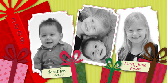 Family Christmas Card by thebryanrose on November 25, 2009November 25, 2009 Each year we send a Christmas Card to family and friends that live out of town and do not get to see our family on a regular basis… Last night I designed the card for 2009. Here is a sneak peek for you blog friends and family… Happy Holidays! Share this: Click to share on Facebook (Opens in new window) Facebook Click to share on X (Opens in new window) X Like Loading... Related
