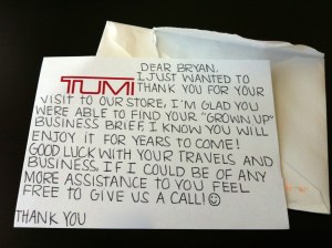 Yesterday (less than a week later), I received a handwritten note from the salesperson at the TUMI store thanking me for my purchase. She also commented on my “grown up” purchase and assured me I would enjoy it for years to come. She also offered to be of assistance for any future needs I will have (like the carry-on suitcase I was looking at).